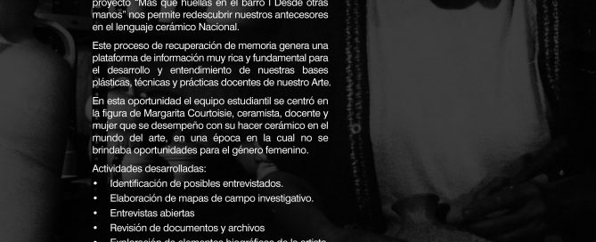 La línea de investigación, estudio y difusión del proyecto “Mas que huellas en el barro. Desde otras manos” nos permite redescubrir nuestros antecesores en el lenguaje cerámico Nacional. Este proceso de recuperación de memoria genera [...]