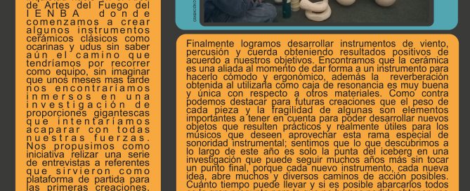 El objetivo del proyecto fue desarrollar instrumentos musicales utilizando la cerámica como base, añadiendo la particularidad de que sirviesen para ejecutar piezas musicales con instrumentos de afinación tradicional. Cuando comenzamos a transitar este camino advertimos [...]