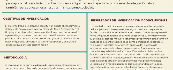 Este proyecto constituye un aporte al conocimiento del reciente flujo migratorio proveniente de África Occidental en Uruguay, abarcando las trayectorias de los sujetos, las dificultades en sus procesos de integración y advirtiendo sobre diferentes situaciones [...]