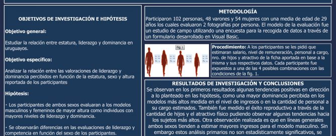 Facultad de Psicología UdelaR Integrantes: Sergio E. Marshall, Luján Olivera, Jennifer Corrales Orientadores: Alvaro Mailhos, Ignacio Estevan La presente investigación indaga la relación entre la altura física y el liderazgo en hombres y mujeres uruguayos/as. [...]