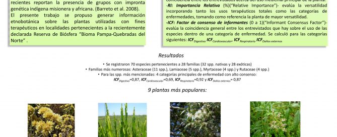 El presente trabajo se propuso generar información etnobotánica sobre las plantas utilizadas con fines terapéuticos en localidades pertenecientes a la recientemente declarada Reserva de Biósfera “Bioma Pampa-Quebradas del Norte”. Con este fin se realizó una [...]