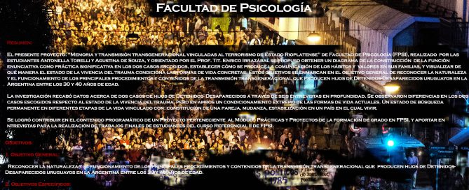 El presente proyecto: “Memoria y transmisión transgeneracional vinculadas al terrorismo de Estado Rioplatense” de Facultad de Psicología (FPSI), realizado por las estudiantes Antonella Torelli y Agustina de Souza, y orientado por el Prof. Tit. Enrico [...]