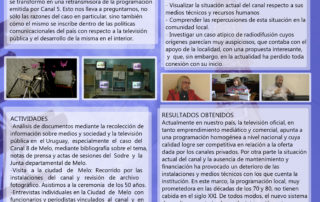 El proyecto de investigación se denomina La televisión pública: el caso del canal 8 de Melo, y tuvo como objeto de estudio el desarrollo histórico e institucional de ese canal [...]